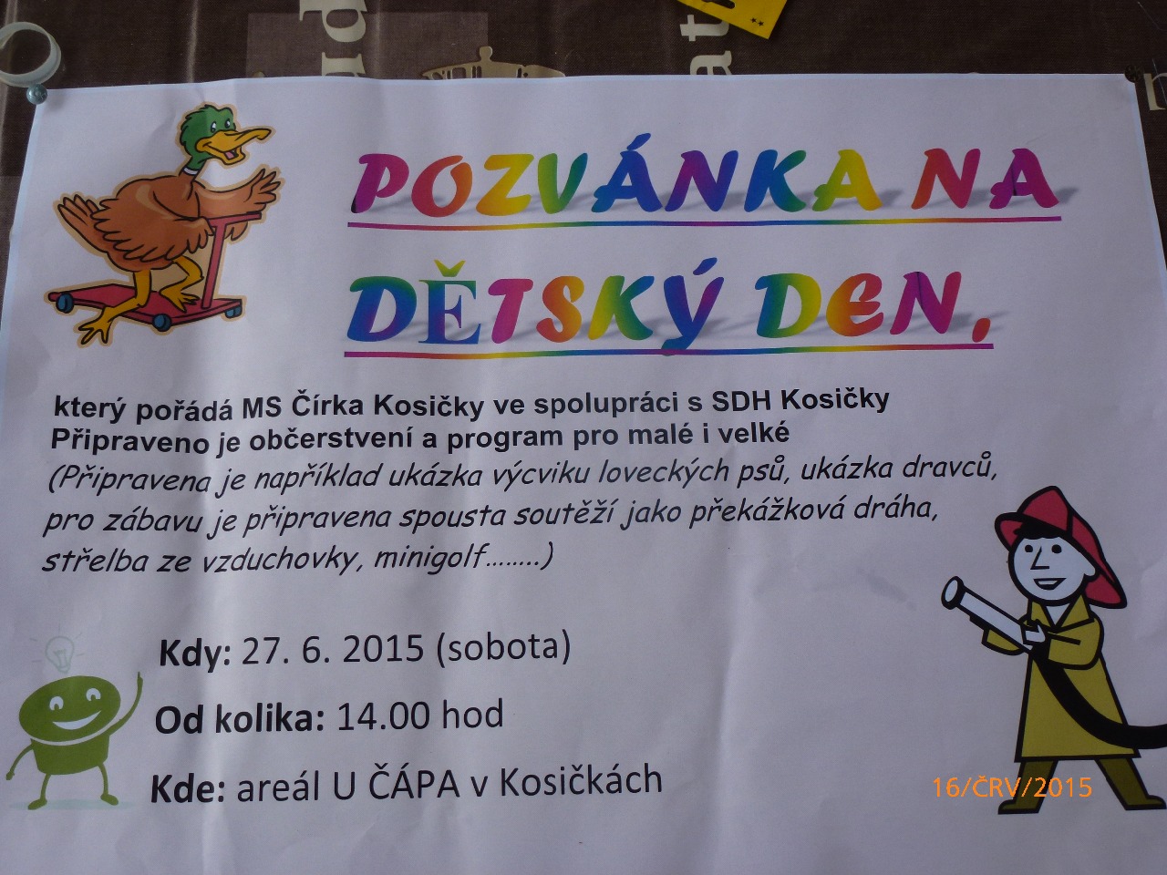 Sobotu 27.6.2015 od 14 hodin jsme v areálu U Čápa v Kosičkách ve spolupráci s SDH Kosičky pořádali Dětský den. Děti si užili spoustu soutěží, ukázku dravců, prohlídku hasičského auta a krásné odpoledne jsme zakončili opékáním párků. Velice děkuji našim členům panu Zdeňkovi Sajkršmídovi a panu Jiřímu Hájkovi a hasičkám, zda organizaci občerstvení a souteží pro děti.